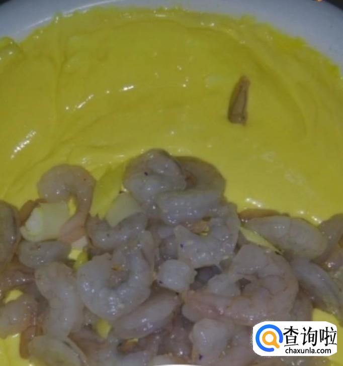 然后我们将腌好的虾仁放入面糊中,均匀的裹上一层面糊