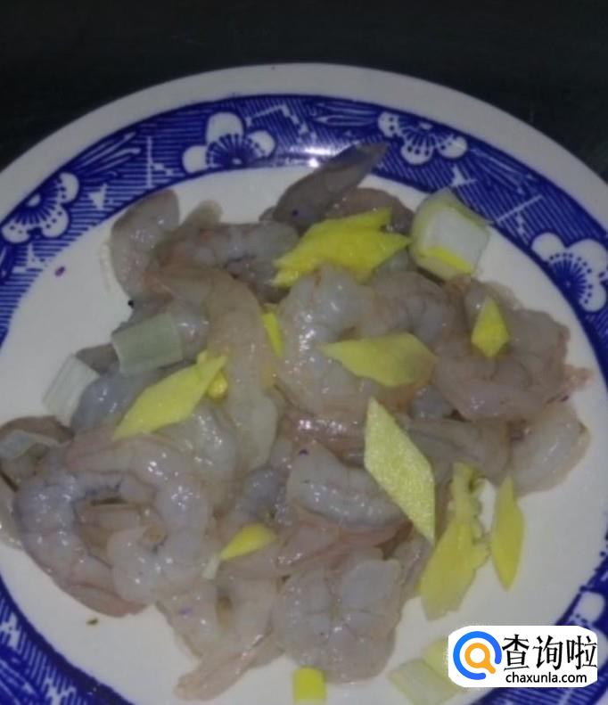 然后我们将虾仁清洗干净,放入葱姜吗,料酒,鸡精,盐,腌制20分钟
