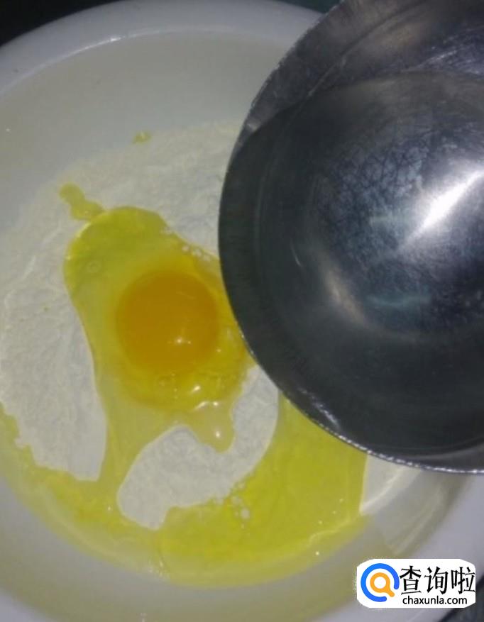首先我们将面粉倒入一个盆中,打入两个鸡蛋,加适量的清水,再倒入适量的食用油,搅拌均匀备用