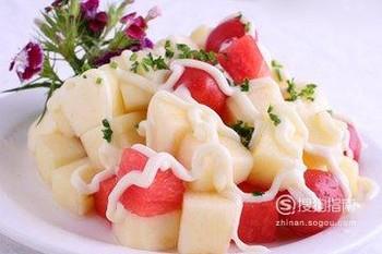 苹果沙拉。非常简单的一道减肥食谱,苹果去皮切块装盘,挤上沙拉酱就可以了,很简单哦。
