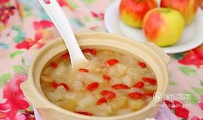 苹果汤。苹果去皮切丁,做成酸酸甜甜的苹果汤非常受小朋友的喜爱哦。