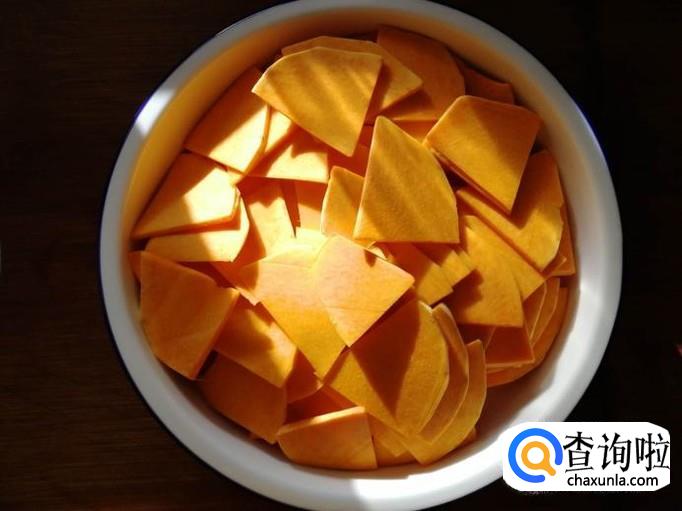 挑选掂着更重的黄南瓜,剖开切块后,将南瓜削去外皮,清水洗净。