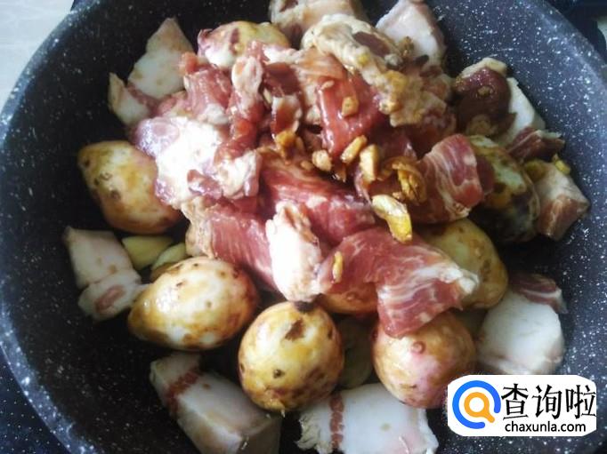 把剩下瘦肉铺在小芋头面上,然后加半碗水进去。