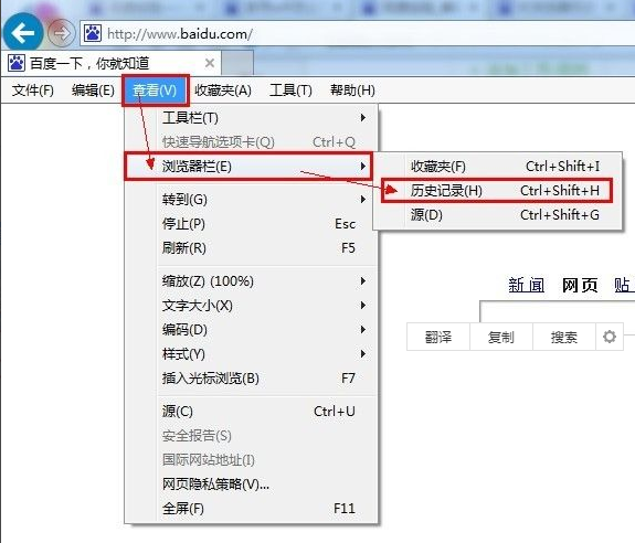 3、您也可以通过“查看”-》“浏览器栏”-》“历史记录”找到IE浏览器的历史记录在哪。
