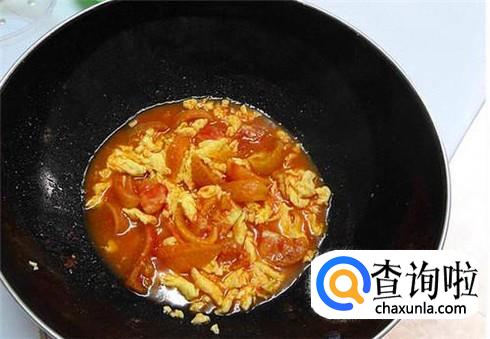 锅里倒油烧热,把鸡蛋打进锅里炒熟,接着把番茄放进去一起炒,加上一点葱花和一点白糖翻炒,西红柿变软之后加入食盐调味。