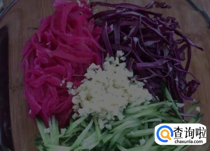将火龙果皮儿切成丝,黄瓜切成丝,再将紫菜切成丝,将这三种食材混合,在家我少许的蒜末,番茄酱,搅匀,火龙果皮儿沙拉就这样诞生了