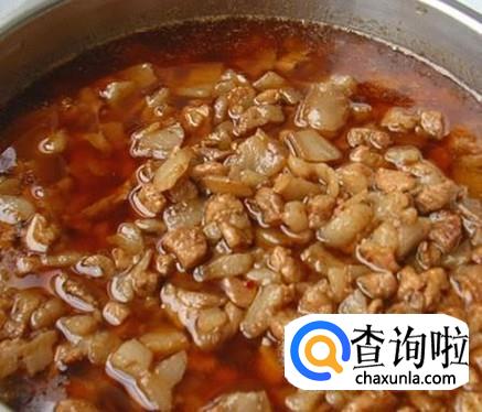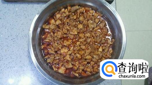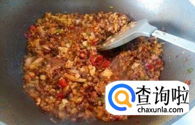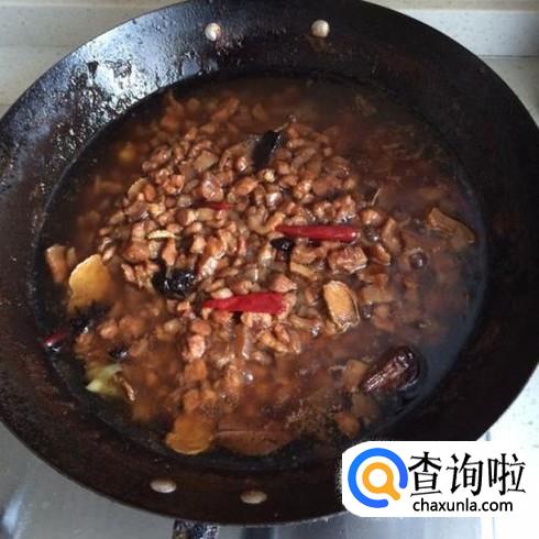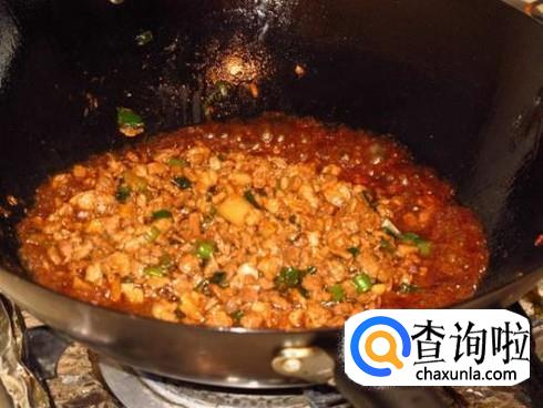 翻炒后盖上锅盖,用中小火来炖肉沫,直到料酒快被熬干时,打开锅盖,不停地翻炒肉沫,以防肉沫黏在锅边。