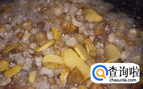 再次翻炒锅中的肥肉和生姜等,然后倒入瘦肉的肉沫,同时倒入盐和一些料酒,料酒需要把肉沫完全淹没,然后再翻炒几分钟。