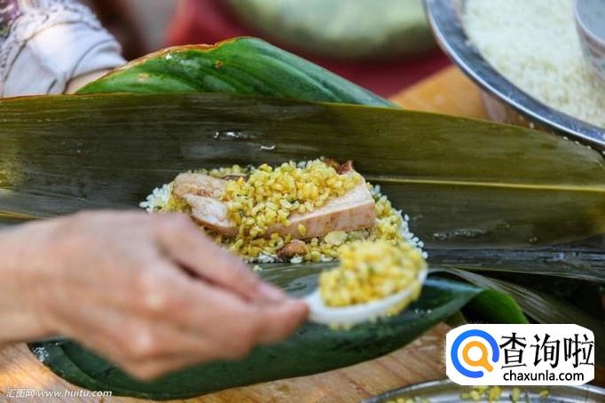 最后把准备好的五花肉和浸泡好的糯米放入煮好的粽叶里面,用粽叶包裹起来,最后用粽绳固定就可以了。