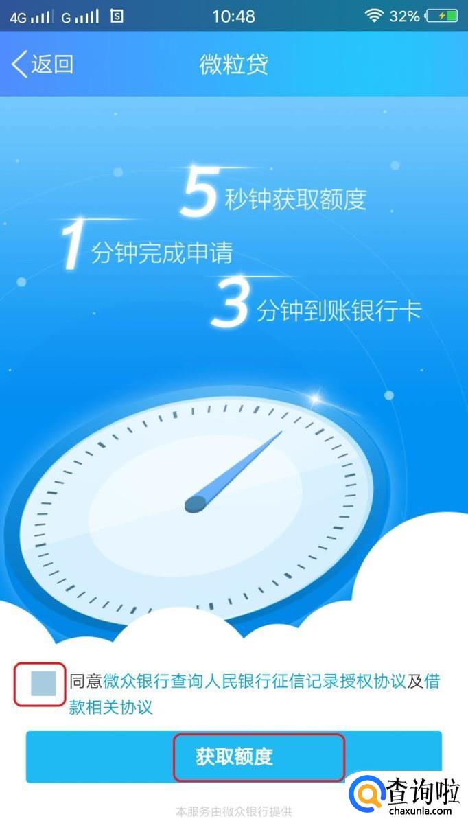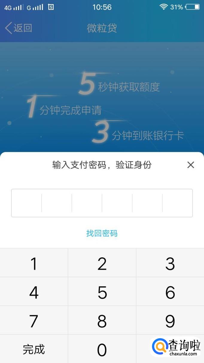 如果已经绑卡了,则直接点击“微粒贷借钱”,进入贷款界面,我们勾选“同意”按钮,点击“获取额度”,输入支付密码,就能看到我们最高能借多少钱了,根据自身需要,不超过贷款额度借钱就行。