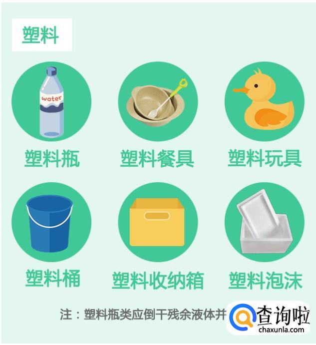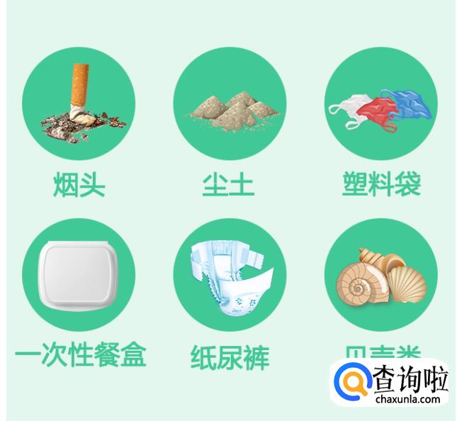 塑料:各种塑料袋、塑料泡沫、塑料包装、一次性塑料餐盒餐具、硬塑料、塑料牙刷、塑料杯子、矿泉水瓶等。