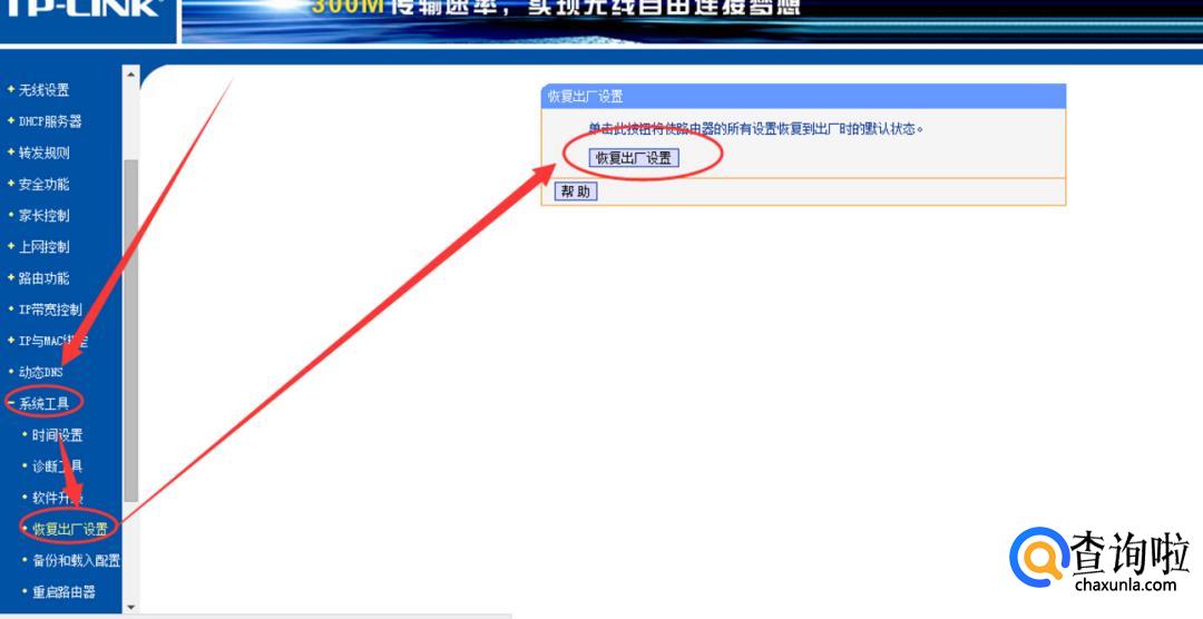 点击系统工具的重置路由器(恢复出厂设置)。