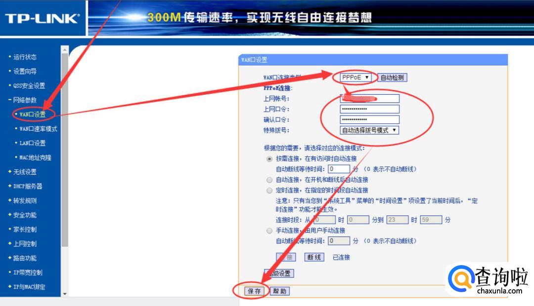 将网络参数的WAN口设置点开,将连接类型改成PPPoE,重设上网账号,点击保存。