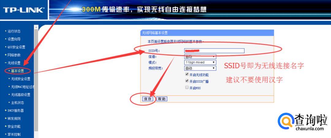 在左侧找到【无线设置】选项,选择【基础设置】,将SSID号重新更改一下名字(建议不要使用汉字),点击【保存】。