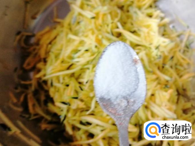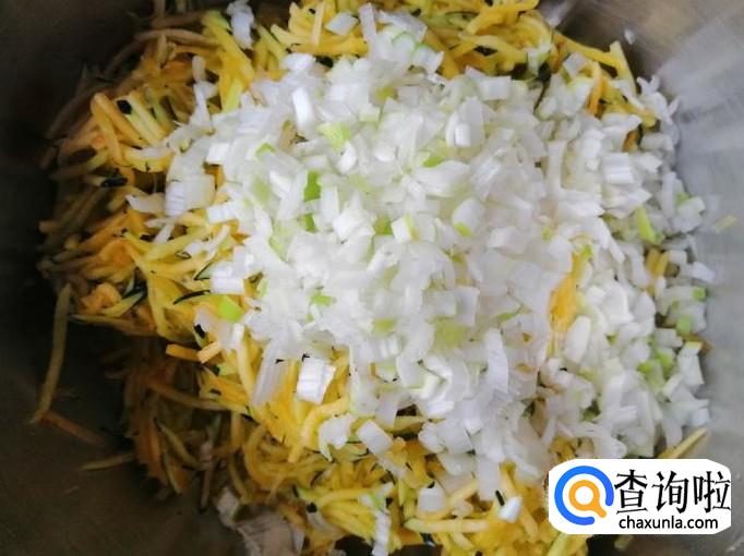把擦好的南瓜丝,撒入适量食盐杀水,用手攥掉南瓜水份,放入大点的容器中,加入切好的葱末。