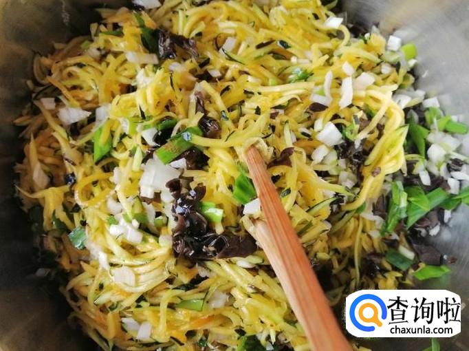 适量南瓜、葱、木耳、五香粉、食盐、香油、韭菜