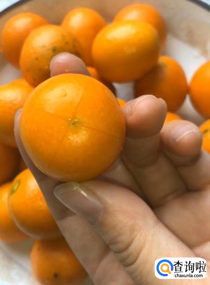 首先我们将准备好的金桔清洗干净,用刀子在上面打上花刀