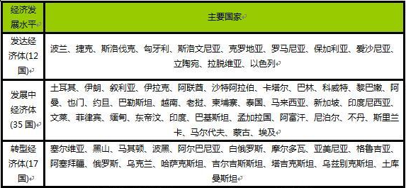 “一带一路”沿线国家大多属于发展中国家和转型经济体,经济发展后发优势强劲,与中国经济具有良好的互补性。这一区域属于发达经济体的国家共有12个,分别是波兰、捷克、斯洛伐克、匈牙利、斯洛文尼亚、克罗地亚、罗马尼亚、保加利亚、爱沙尼亚、立陶宛、拉脱维亚和以色列,除以色列以外,发达经济体主要分布在中东欧地区。虽然不少石油输出国家的人均收入都达到发达国家水平,但其国民收入主要依赖石油出口,因而通常不将其划归到发达国家。