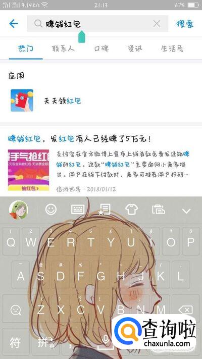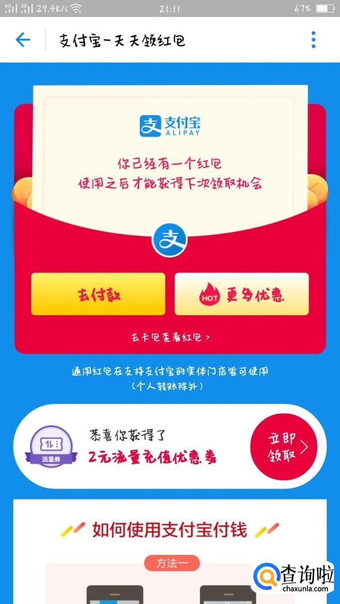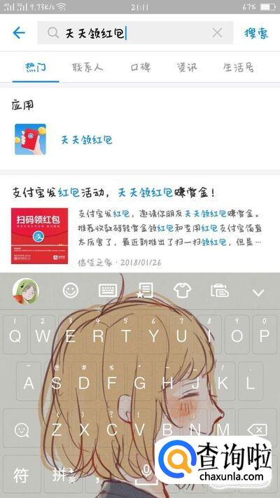 打开支付宝,在搜索界面输入“天天领红包”,就可以去领取一个红包了,不过红包的大小是随机的哦,可能是几十块,也可能是几角钱,都是说不定的。
