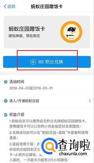 或者可以使用蚂蚁积分兑换“蹭饭卡”,消耗88点蚂蚁积分即可成功兑换一张“蹭饭卡”。