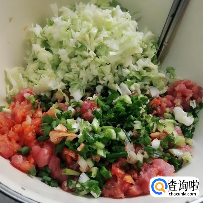 再把包菜洗干净切碎放在装猪肉的大碗里,香葱也切碎放进去,然后再放蚝油,鸡粉,一勺盐,搅拌均匀做成饺子馅。