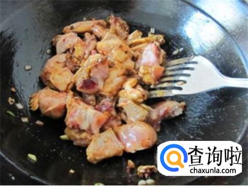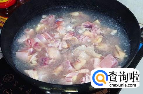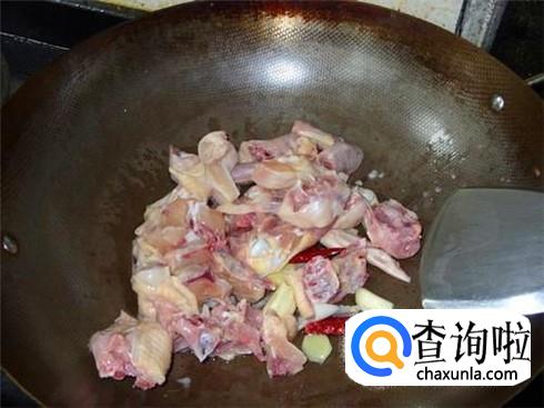 把鸡剁成块之后,用凉水清洗几遍,然后锅里烧一锅开水,把鸡块放进去,用漏勺翻几下,让鸡块全部受热均匀,等到鸡肉变白捞出来放清水里浸泡一会儿,然后捞出来控干水分。