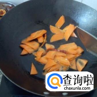 锅中加油,8分热时加辣椒,翻炒,然后加胡萝卜片,翻炒1分钟。