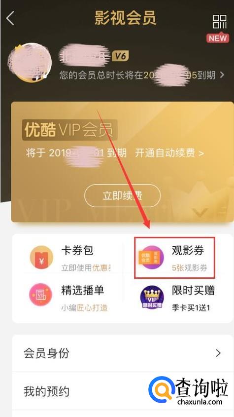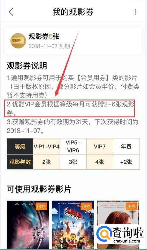 进入到“我的观影券”界面,我们能看到观影券使用说明:优酷VIP会员根据等级每月可获赠2-6张观影券。除了系统赠送外,还可以通过好友赠送的方式来获取观影券。