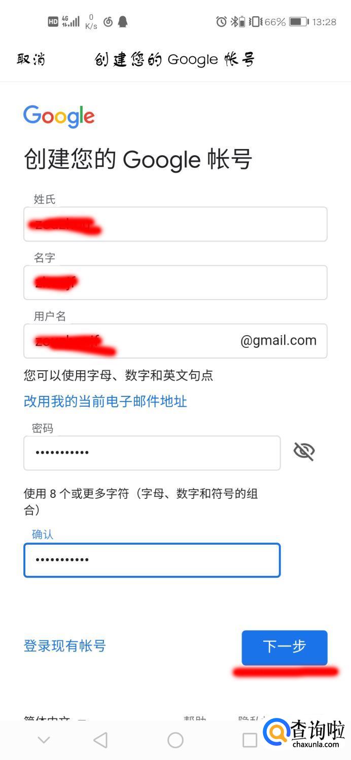 创建你的谷歌账号 (包括姓氏 名字 用户名 密码 ) 填写完毕后 ,点击“下一步”