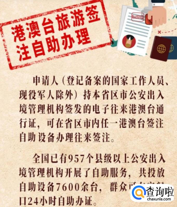 申请人(登记备案的国家工作人员、现役军人除外) 持本省区市公安出入境管理机构签发的电子往来港澳台通行证,可在省区市内任一港澳台签注自助设备办理往来签注。全国已有957个县级以上公安出入境管理机构开展了自助服务,共投放自助设备7600余台,群众可在家门口24小时自助办证。