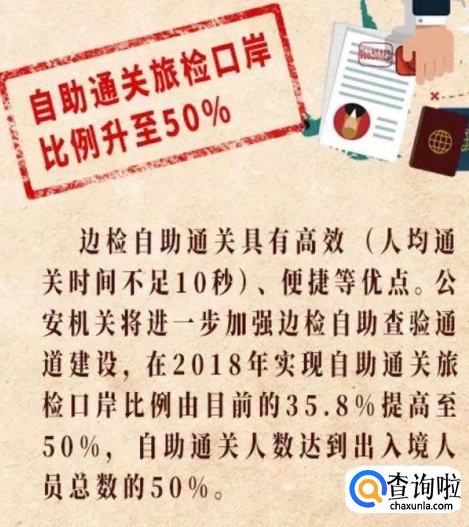 自助通关旅检口岸比例升至50%:边检自助通关具有高效(人均通关时间不足10秒)、便捷等优点。公安机关将进一步加强边检自助查验通道建设,在2018年实现自助通关旅检口岸比例由目前的35.8%提高至50%,自助通关人数达到出入境人员总数的50%。