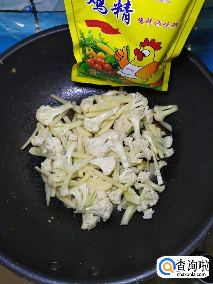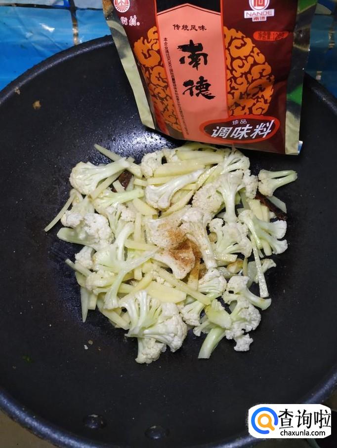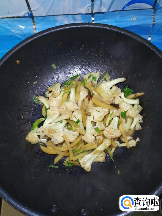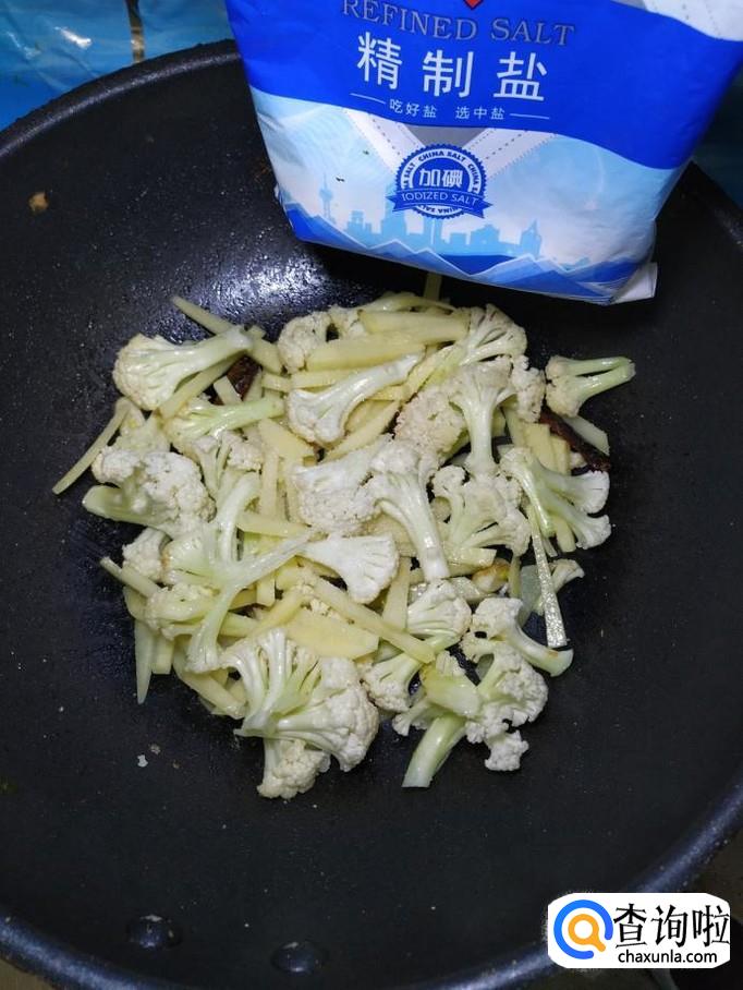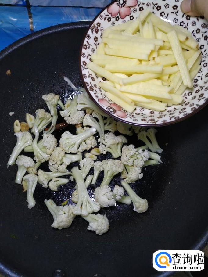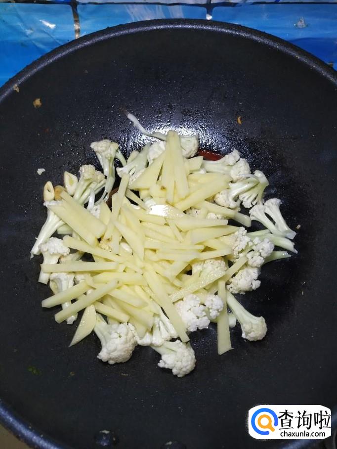 然后将土豆倒入锅中,和花菜一起翻炒。