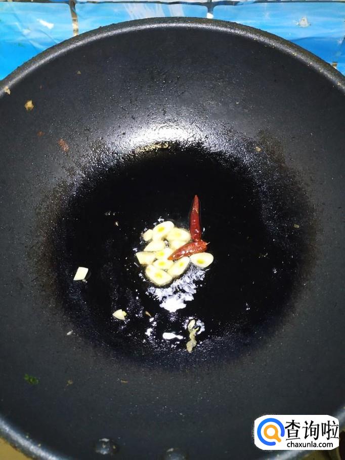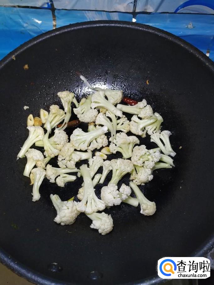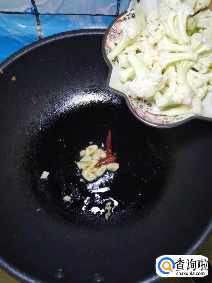 准备适量蒜,洗净后切片。炒锅中放入适量油,油热后,放入蒜片和干辣椒炒香,然后将花菜倒入锅中,翻炒均匀,可以盖上锅盖,小火焖炒。