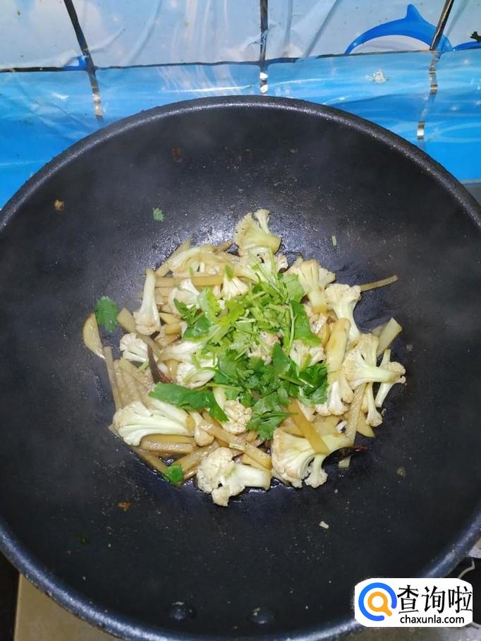 准备适量香菜,洗净后切碎,放在上面,搅拌均匀。