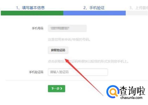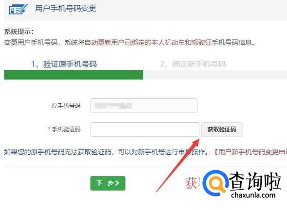 接着会进入到原手机号验证的界面,需要点击获取验证码,点击下一步,如下图所示