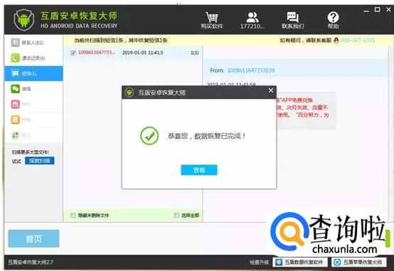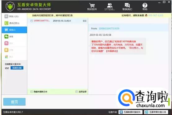 除了使用云盘等存储工具可以留住删除的短信,还可以使用恢复数据的软件井手机中删除的手机短信进行恢复,我们使用互盾安卓恢复大师扫描手机里面的数据,将数据扫描出来之后可以将需要的数据进行恢复的。 - 05