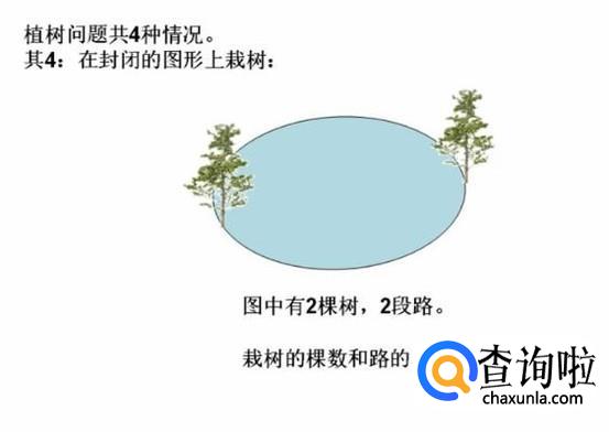 在封闭的图形上栽树时,图中有2颗树2段路,栽树的棵树和路的段树相同。