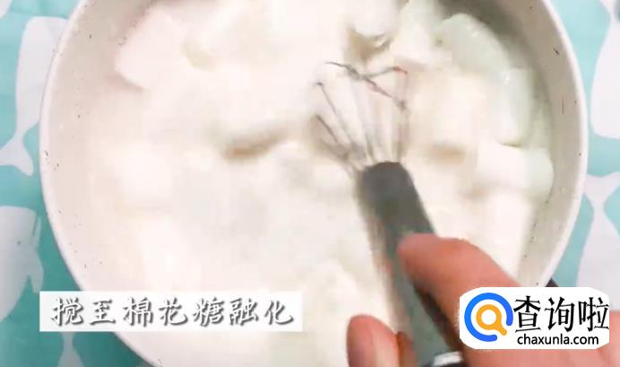 用搅拌棒不停搅拌,直至棉花糖全部融化。