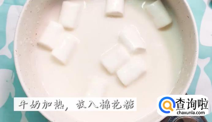接着,将牛奶倒入锅中加热,然后再放入棉花糖。