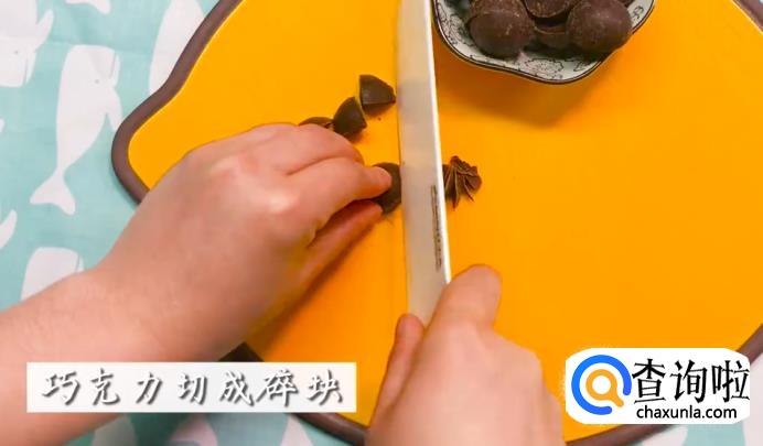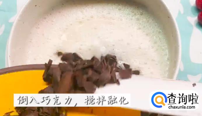 然后,将切好的巧克力碎倒进锅中,继续搅拌至融化。