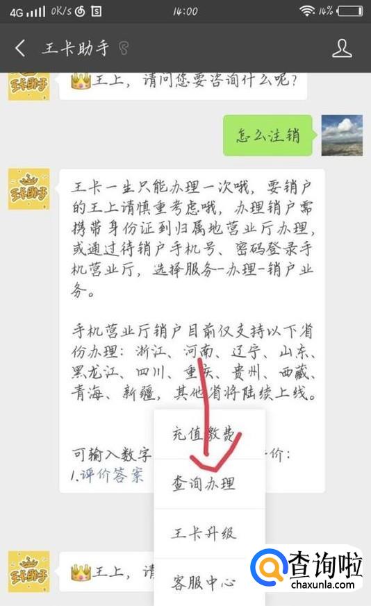 有两种办法,第一种是带着你的身份证到你办卡的地方进行销户。还可以在网上办理。点击“服务”选项,如图1箭头所示。再点击“查询办理”选项,如图2所示。登录手机营业厅进行办理。不知道密码的随机密码就可以登录了。