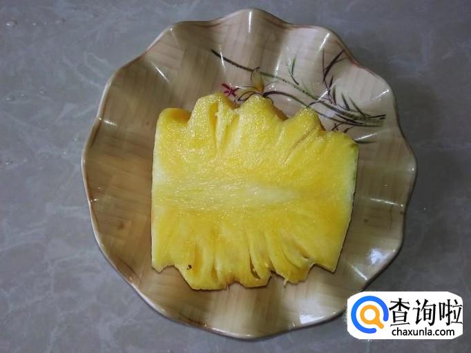 把菠萝去皮,然后用盐水泡几分钟捞上来备用。