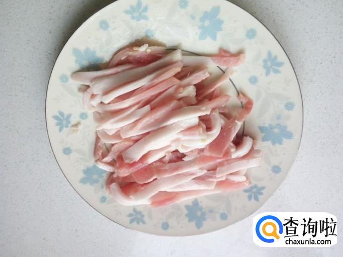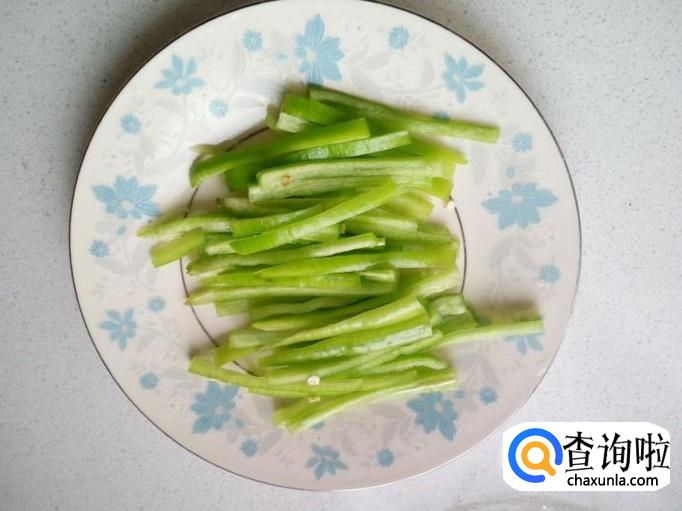 青尖椒用水清洗干净,控干水分,切成0.5公分左右的丝。五花肉切成和青尖椒同样大小的丝,备用。