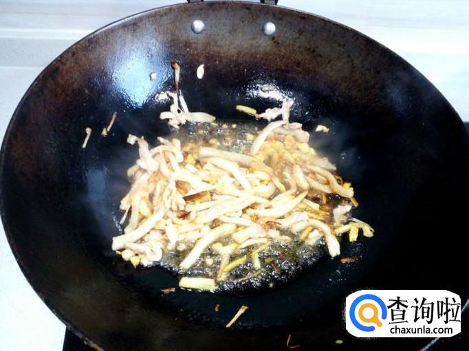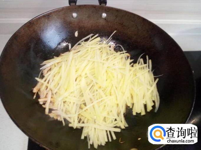 锅内放入油加热,油热后放入花椒,葱,姜,蒜,爆锅。随即放入肉丝翻炒,放入少许料酒,醋,酱油。