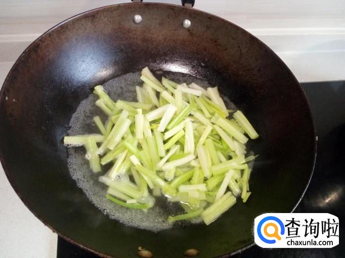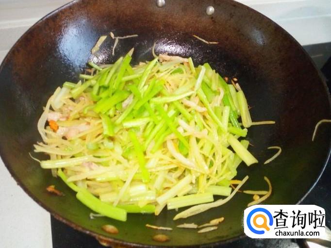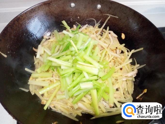 然后放入土豆丝翻炒。土豆丝炒至七分熟,放入芹菜快速翻炒,放入盐。