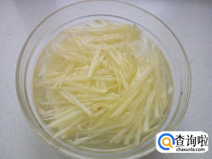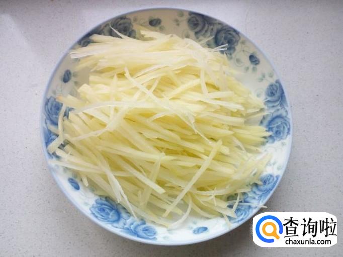 土豆去皮洗净,切成细丝,放入清水中浸泡一下,去除上面的淀粉,然后用水冲洗干净,控干水分,备用。