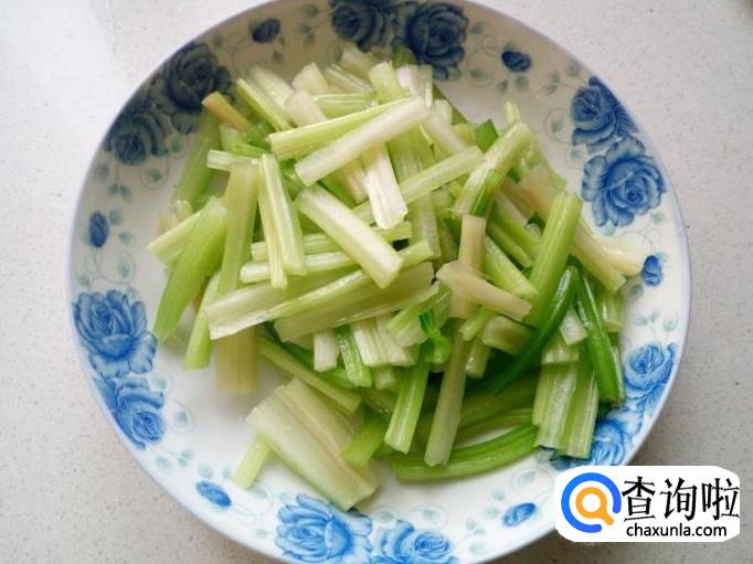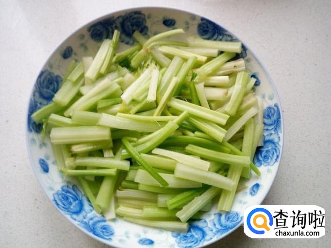 芹菜放入开水中汆一下,入锅几秒钟即捞出,用冷水过凉,沥干水分,备用。