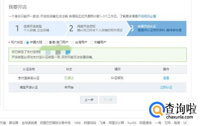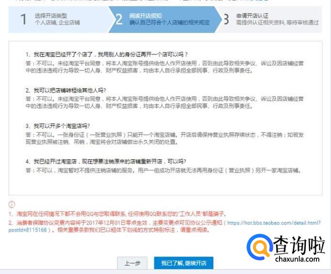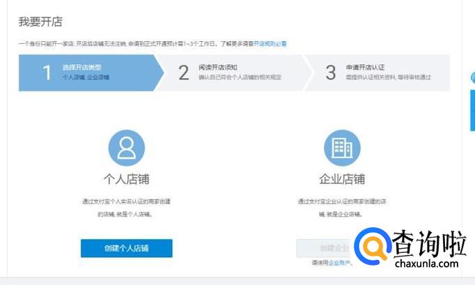 进入后有“个人店铺和企业店铺”,我们选择“个人店铺”创建个人店铺,阅读开店须知,阅读完成继续下一步。