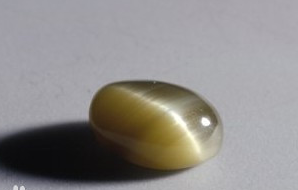 猫眼石,矿物名称为金绿宝石。由于其内部含有金红石的针形内含物或羽毛状的流体内含物,从适当的角度看,折射光会形成一条明亮的光带,并可随光线的移动而发生变化,似猫的眼睛,故名。猫眼石是五大珍贵宝石之一,主要产于斯里兰卡、巴西和中国等地。