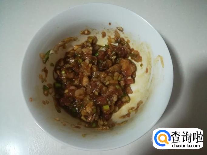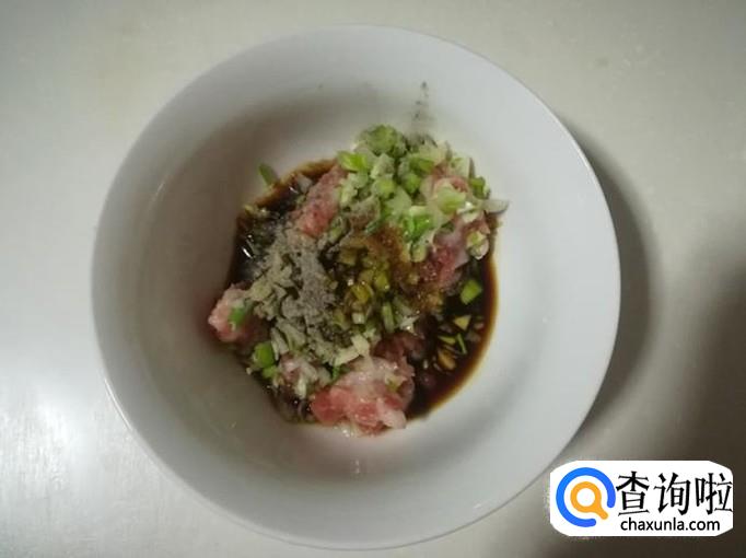 把猪肉泥放碗里,加入葱姜末,1勺盐,1勺生抽,1勺香油,1小勺胡椒粉。